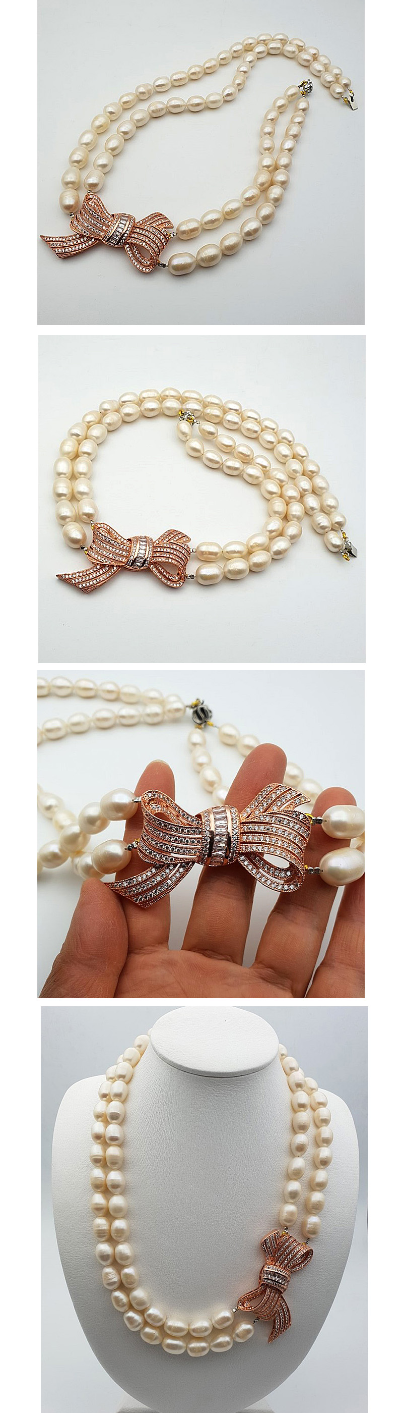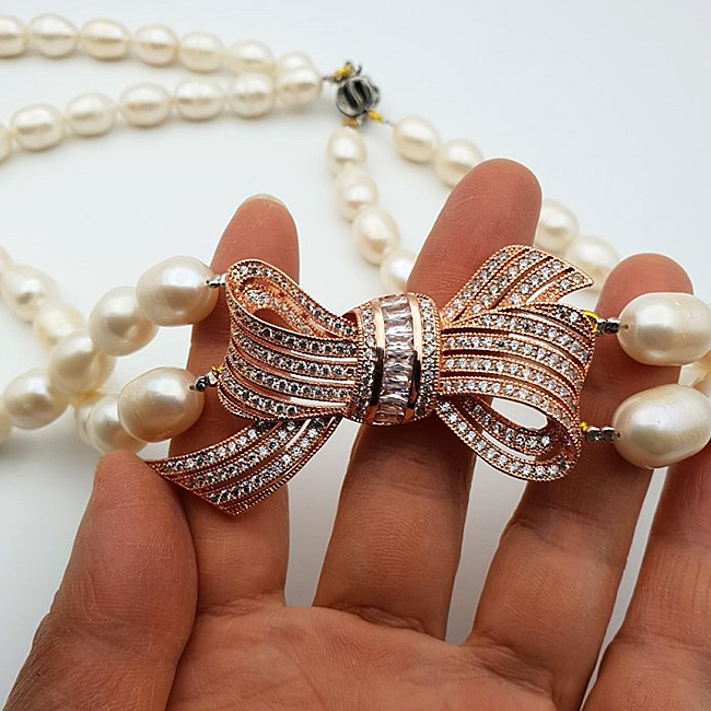 부드러운 크림색과 로즈컬러의 커넥터가 아주 잘 어울리는 진주목걸이입니다.