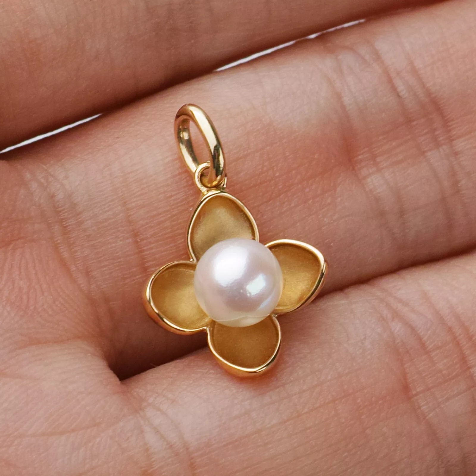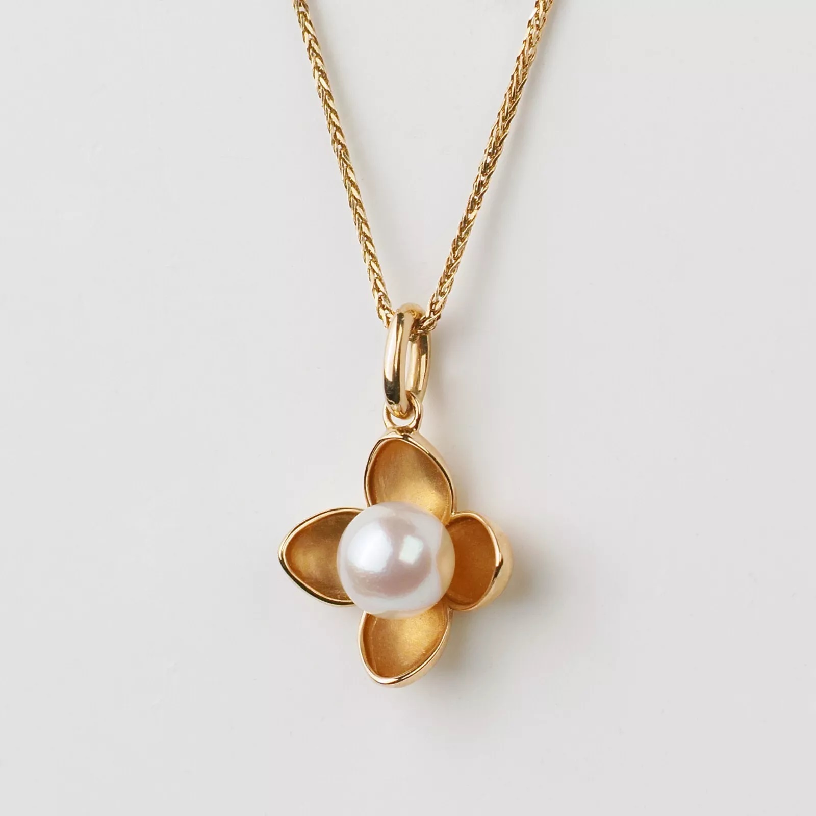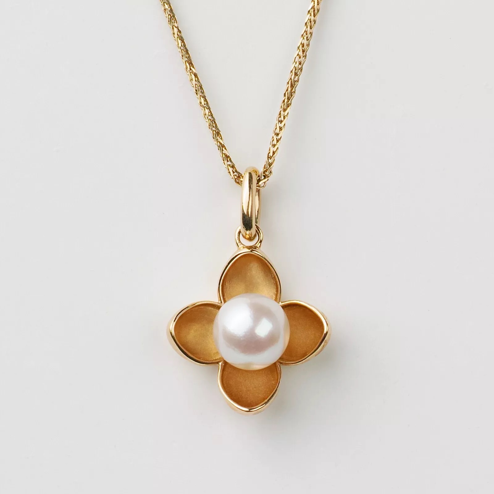 예쁜 꽃잎모양의 14k골드 펜던트 중앙에 하얀 아코야진주가