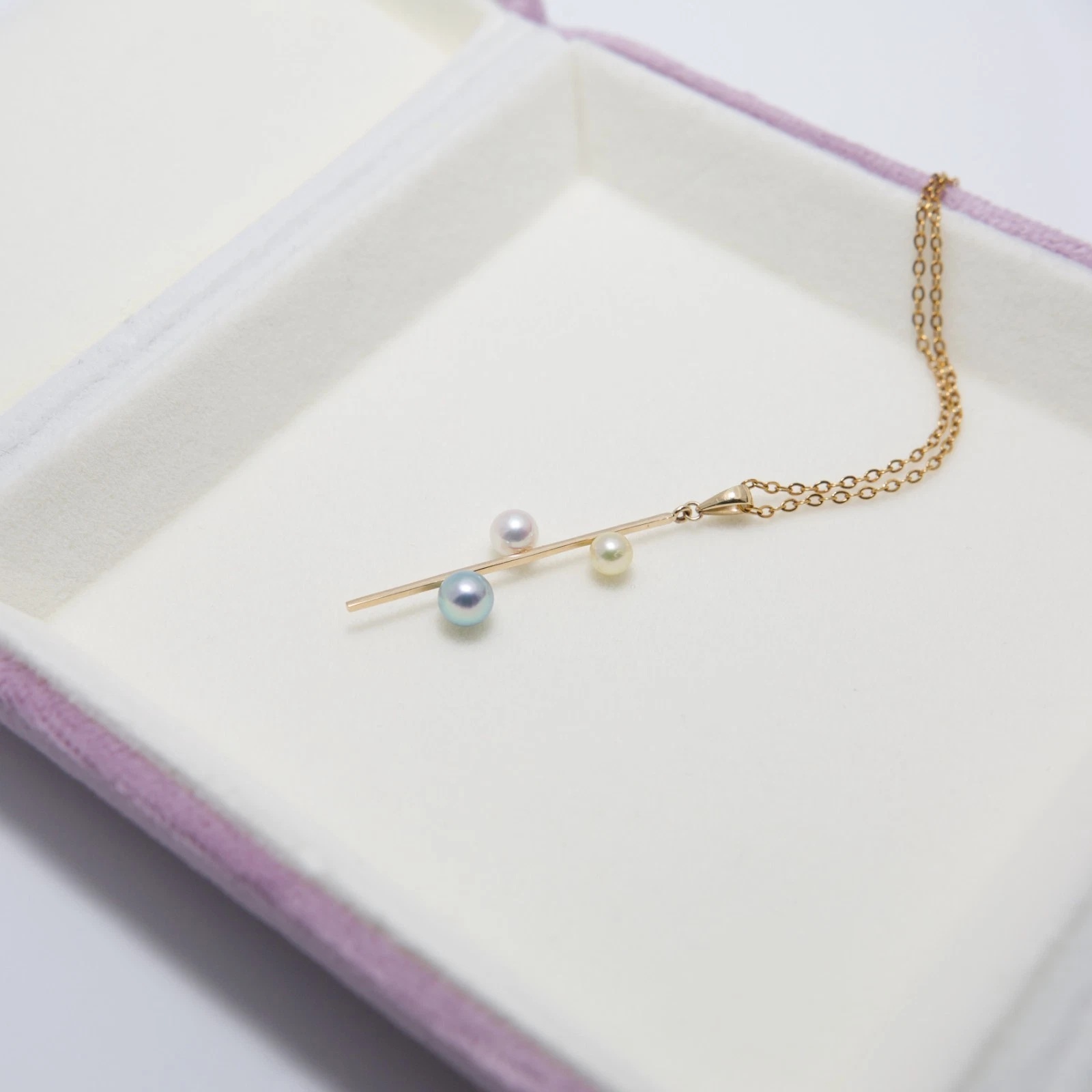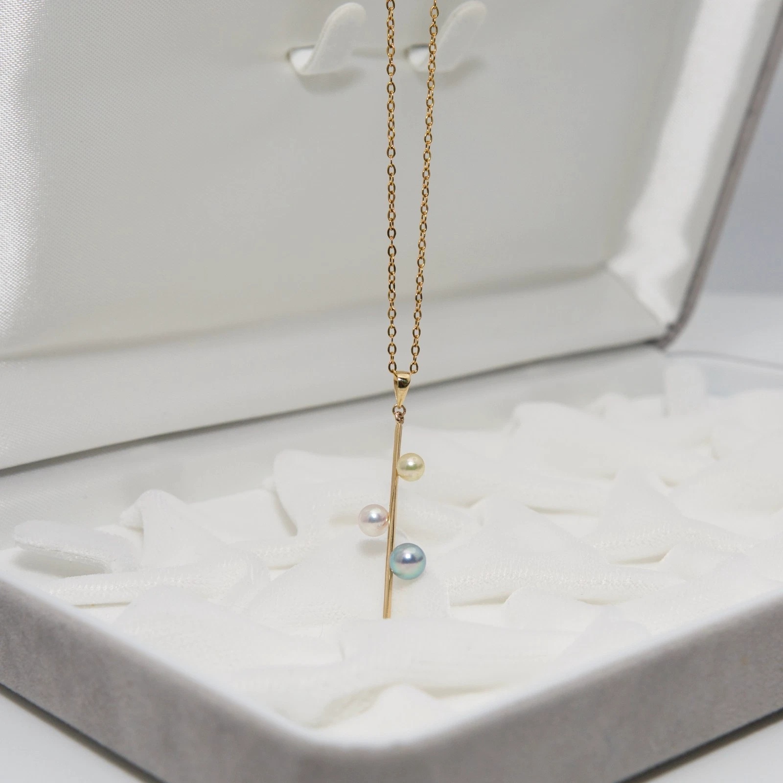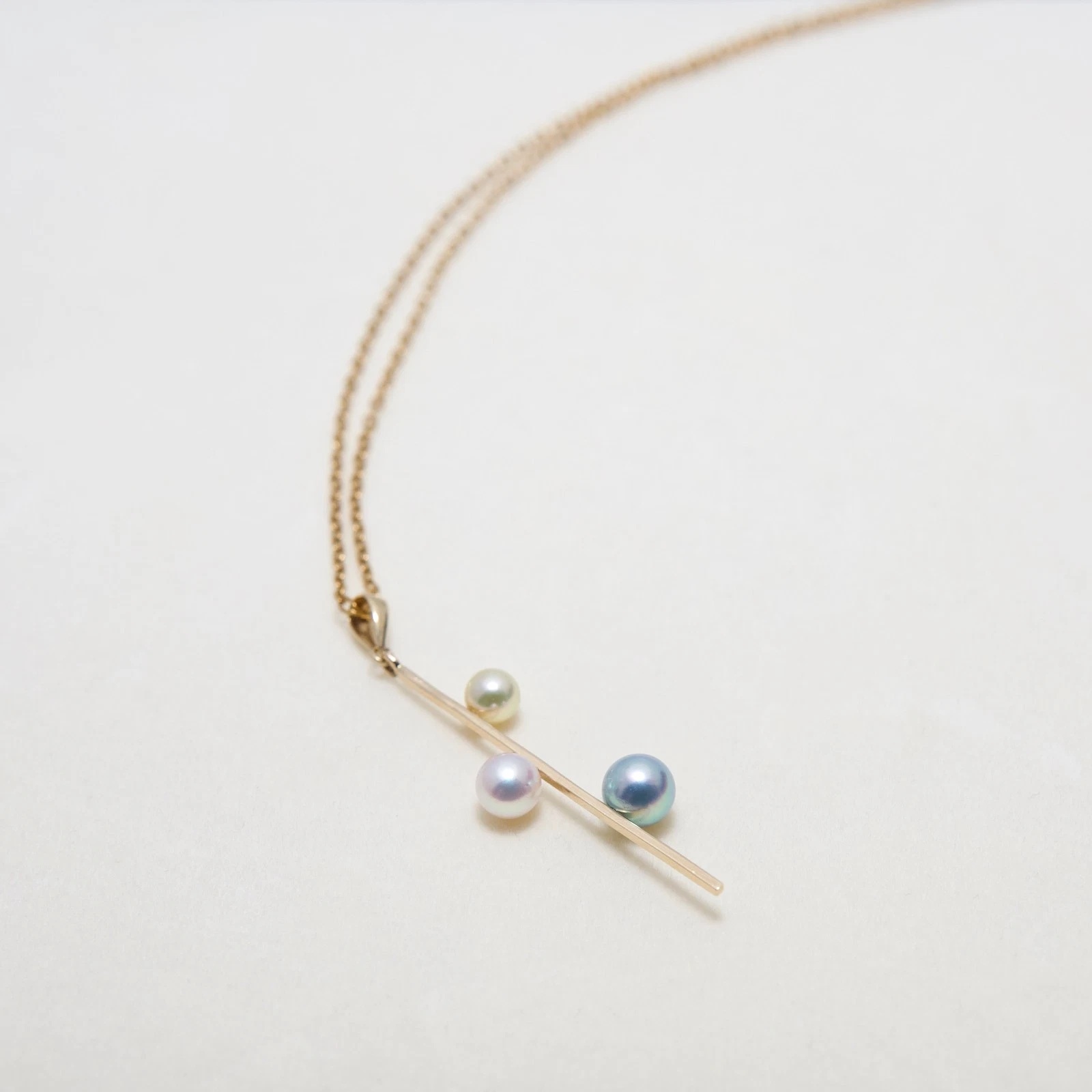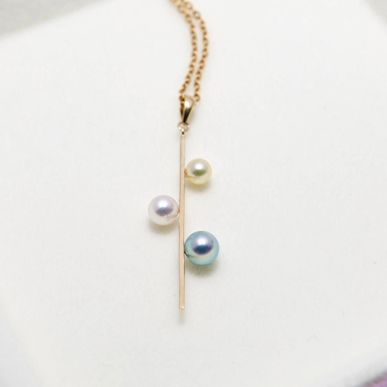 3개의 다른 아코야진주가 막대형14K골드에 세팅되어